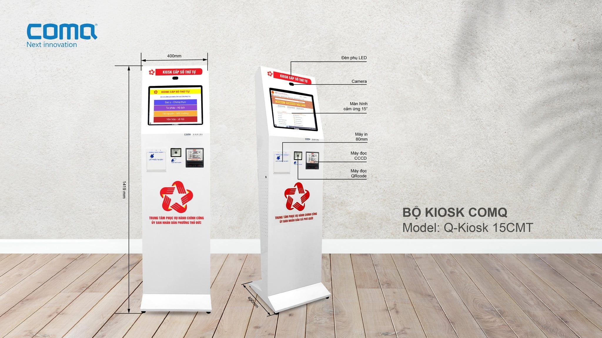 KIOSK in cấp số thứ tự ComQ Q-KIOSK 1543 CMT P80 là sản phẩm đa dụng cho các mục đích in cấp số, trong các hệ thống xếp hàng tư động tại ngân hàng, hành chính công, bệnh viện, hải quan, xăng dầu, bưu chính, điện lực ...Kiosk có tính năng đọc CCCD thẻ CHIP giải mã 16 - 17 trường dữ liệu phục vụ Đề An 06 (DA06) của chính phủ. Ngoài ra Kiosk hoặc có thể đóng vai kiosk self-service trong các nhà hàng, cửa hàng nhằm mục đích bán hàng tự động.