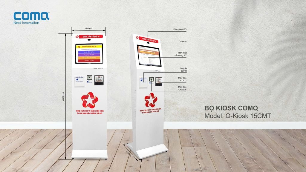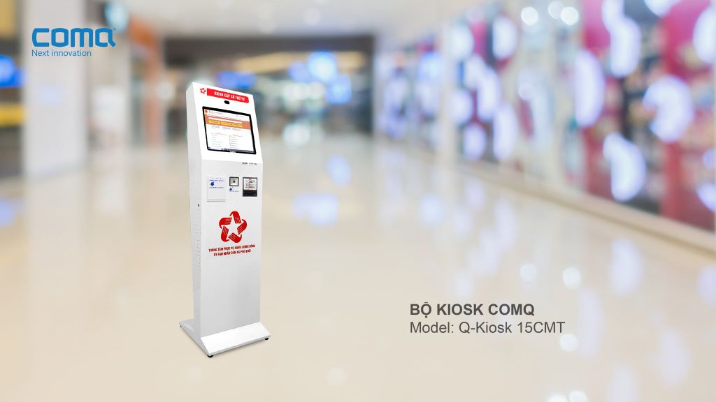 KIOSK in cấp số thứ tự ComQ Q-KIOSK 15CMT_Series là sản phẩm đa dụng cho các mục đích in cấp số, trong các hệ thống xếp hàng tư động tại ngân hàng, hành chính công, bệnh viện, hải quan, xăng dầu, bưu chính, điện lực ... Kiosk có tính năng đọc thẻ CCCD gắn chíp và giải mã 16 - 17 trường dữ liệu phục vụ Đề Án 06 (DA06) chuyển đổi số của chính phủ. Ngoài ra Kiosk hoặc có thể đóng vai kiosk self-service trong các nhà hàng, cửa hàng nhằm mục đích bán hàng tự động.
