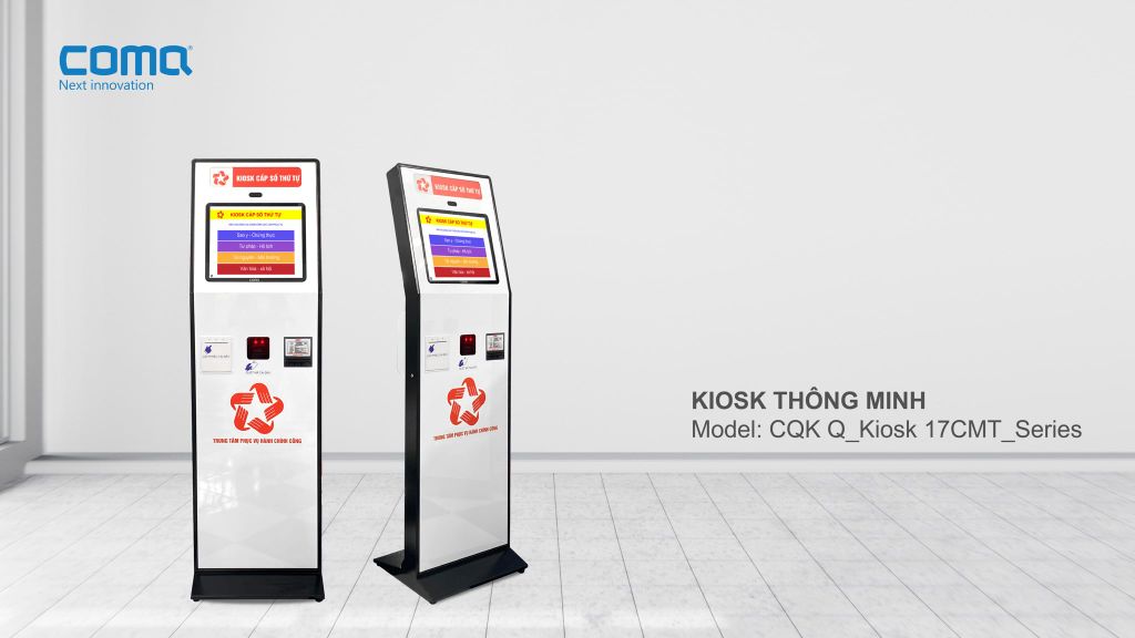 KIOSK in cấp số thứ tự tự động ComQ Q-KIOSK 1783 CMT P80 series là dòng sản phẩm thiết kế chuyên dùng vào mục đích in cấp số thứ tự tại các hệ thống xếp hàng tự động cho: TT Hành chính công, ngân hàng, bệnh viện, hải quam, y tế và các điểm công cộng khác. Kiosk cũng có thể sử dụng làm thiết bị tra cứu thông tin, bán vé tự động và các dịch vụ khác. Kiosk có thể cấu hình máy in phiếu, đầu đọc QRcode, đọc thẻ thông minh, camera nhận diện khuôn mặt, đọc vân tay và các thiết bị khác.