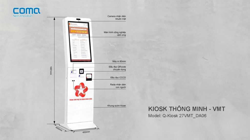 COMQ Q-Kiosk 2785VMT_DVC3 là dòng kiosk dịch vụ công tự động thế hệ mới, được nghiên cứu, thiết kế và sản xuất tại Việt Nam, đáp ứng đầy đủ yêu cầu triển khai dịch vụ công trực tuyến, toàn trình theo Đề án 06 của Chính phủ. Thiết bị tích hợp đồng bộ phần cứng công nghiệp mạnh mẽ và nền tảng phần mềm Q.AI thông minh, giúp người dân chủ động thực hiện thủ tục hành chính nhanh chóng, chính xác và thuận tiện.