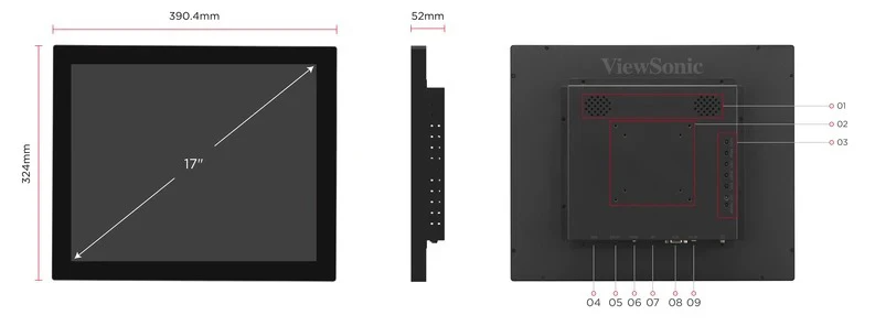 - (Chú thích: 01. Speaker; 02. VESA Compatible (Wall Mount 75 x 75 mm & 100 x 100 mm); 03. Menu Control Panel; 04. USB; 05. DC12V; 06. HDMI; 07. DP; 08. VGA; 09. PC IN)