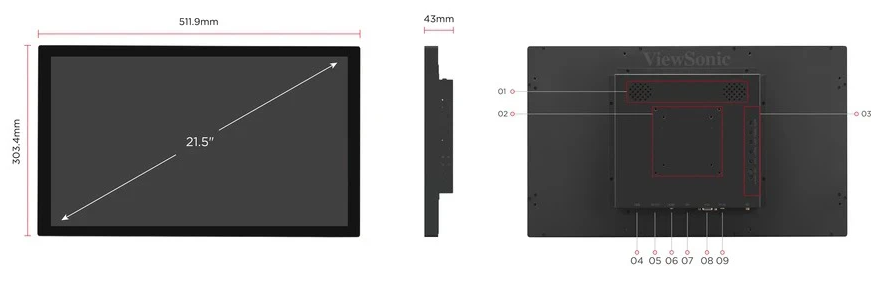 - (Chú thích: 01. Speaker; 02. VESA Compatible (Wall Mount 75 x 75 mm & 100 x 100 mm); 03. Menu Control Panel; 04. USB; 05. DC12V; 06. HDMI; 07. DP; 08. VGA; 09. PC IN)